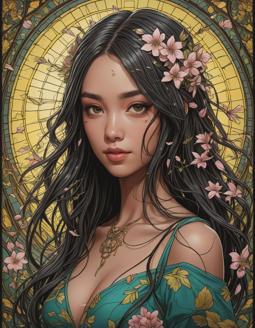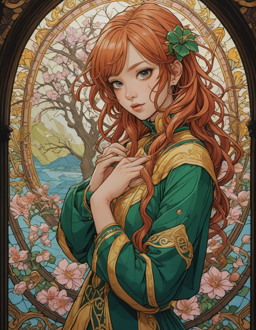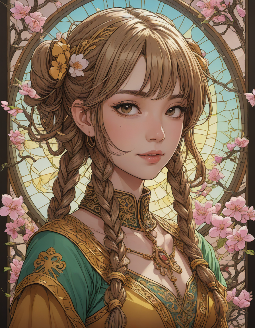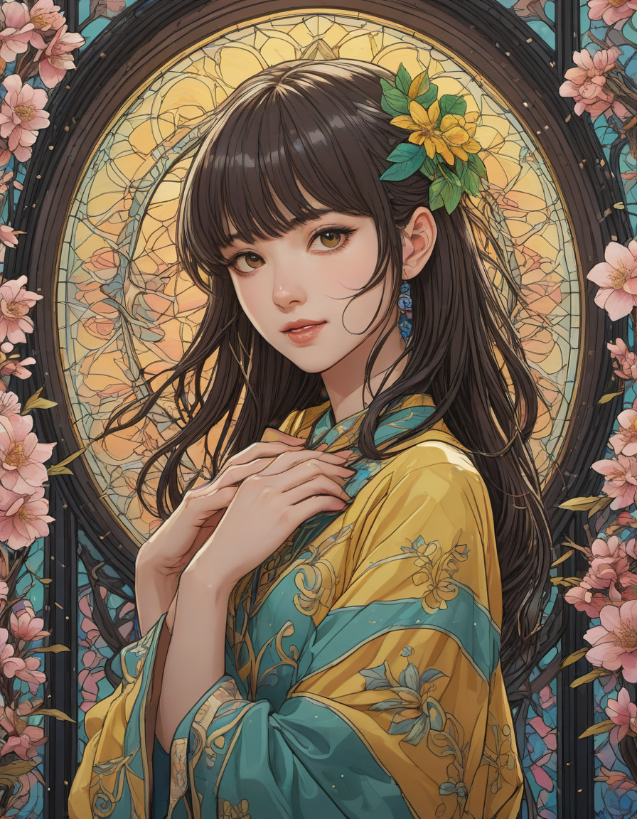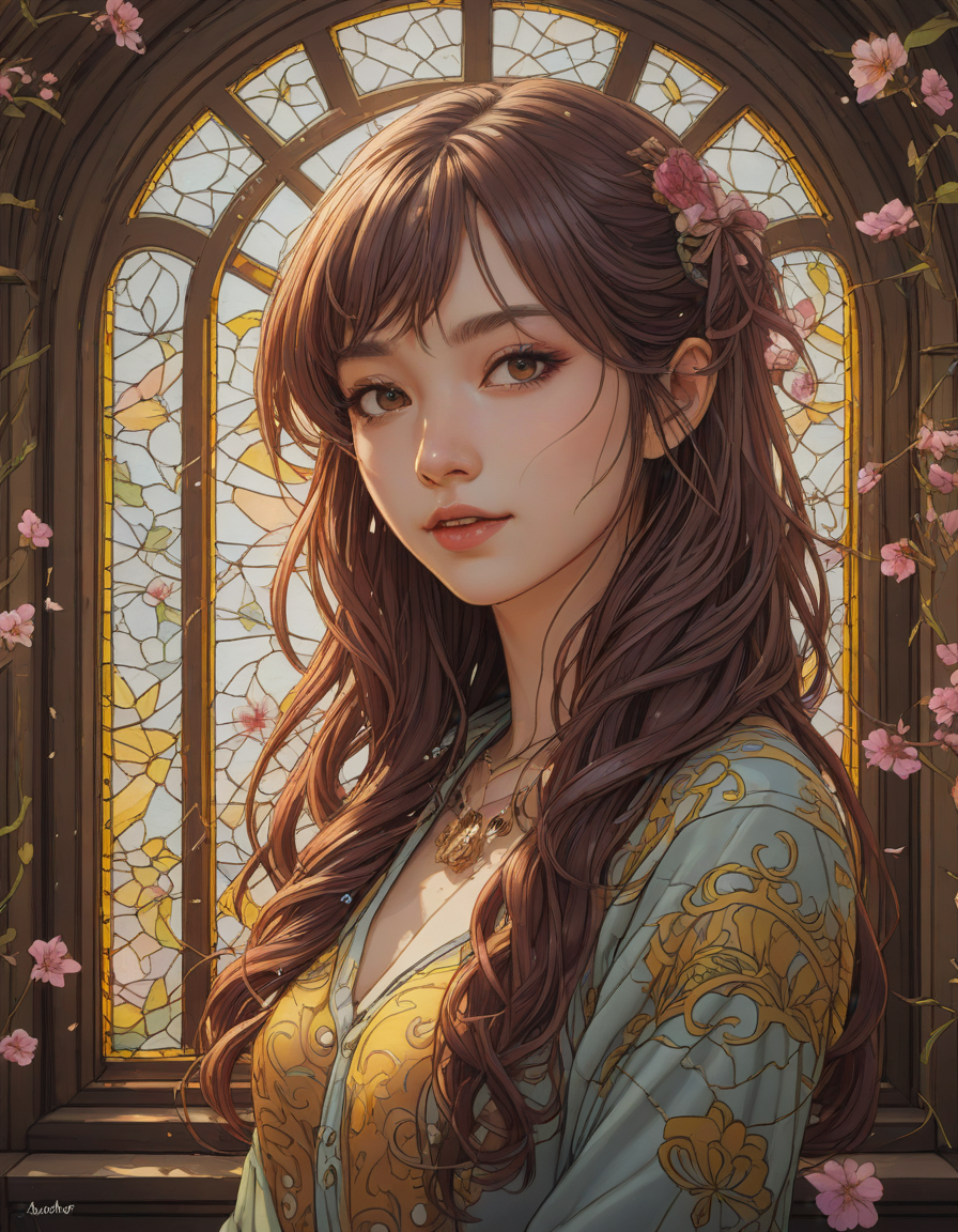 love, heavy inking, Unkempt, stained glass window, with intricate patterns, Vulnerable, pop idol, vibrant, glowing, and healthy skin, anime, expertly blending, mesmerizing color palette, Blossoming cherry trees, petals falling like snow, leprechaun, elated, yellow team