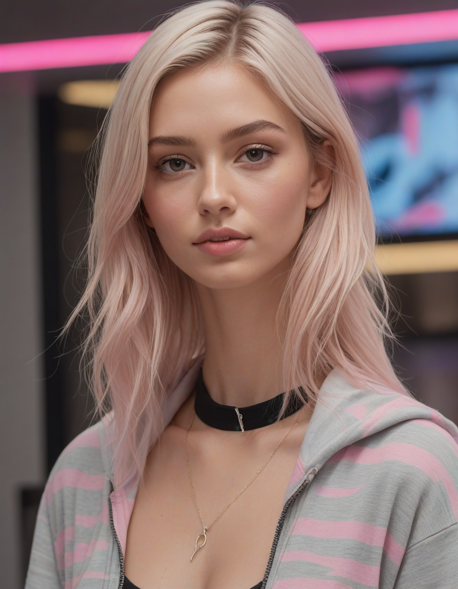 This visualization retains the essence of our previous description, now enhanced by a pose that speaks volumes of her confidence and the vibrant spirit of the e-girl aesthetic. It captures not just the photorealistic image of a young woman in the throes of digital age culture but also the bold statement of identity and self-expression that defines her at this significant moment in her life., Visualize a photorealistic portrayal of an 18-year-old high school senior girl, epitomizing the e-girl aesthetic with a blend of internet culture's vibrancy and personal audacity. Clad in an oversized striped shirt under a black graphic t-shirt dress, her style is a testament to e-girl fashion's layered intricacy, complemented by fishnet tights and chunky boots. Her makeup features dramatic winged eyeliner, neon eyeshadow, and dark lipstick, with blush bringing her face to life. Accessories like silver chains and a heart pendant choker, along with pastel or neon hair streaks, enhance her playful rebellion. Standing hands-on-hips, she exudes confidence and individuality against a backdrop suggestive of e-girl life, with neon signs and string lights. This scene captures her bold identity and expressive spirit at this pivotal moment., oval face shape, almond-shaped eyes, voluminous lashes, slightly arched eyebrows, narrow nasal bridge, rounded nose tip, symmetrical nostrils, full lips, pronounced cupid's bow, slightly fuller lower lip, defined cheekbones, rounded chin, smooth complexion, softly contoured jawline, balanced facial proportions, symmetrical features, gently curved eyelids, soft brow ridge, harmonious cheek to jawline transition, subtle philtrum, delicate ear lobes, straight blonde hair, clear skin, hooded eyelids, light pink lip color, slightly pouty expression, casual pose with hand on face, slight head tilt, indoor lighting, Light blue irises, Medium-thickness eyebrows, Softly angled eyebrows, A hint of freckles across the nose and cheeks, Natural makeup, Gentle frown lines between the eyebrows, Soft nasolabial folds, Smooth forehead, Subtle dimple on the chin, Clear facial contour without distinct shadows, Even skin tone with a hint of natural pink undertones, Slightly rosy cheeks, Tapered jawline, Fine hair texture with gentle waves, Youthful appearance with soft facial features, wearing complete set of armor, wearing full armor, Wearing chest armor, wearing leg armor, wearing feet armor, wearing bracer, wearing pauldrons,, Holding a sword in both hands in a confident pose, detailed grip, detailed fuller, detailed pommel, detailed blade, detailed edge, , brick wall -> great window view, Lip fillers, thick full lips, enhanced lip volume, accented cupid's bow, Rhinoplasty, refined nose shape, straightened nasal profile, facial symmetry, Botox injections, smoothed facial lines, reduced wrinkles, youthful appearance, Cheek fillers, pronounced cheekbones, sculpted contours, lifted cheeks, brightened eyes, reduced under-eye bags, rejuvenated area, Liposuction contoured shape, reduced excess fat, sculpted physique, Dermal fillers, restored volume, smoothed texture, diminished lines, strengthened definition, balanced proportions, enhanced jawline, Facelift, tightened skin, reduced sagging, improved skin tone, reduced imperfections, enhanced clarity, Blepharoplasty, Reduced puffiness, restored youthful eye contour, Enhanced chin shape, improves facial harmony, strengthened jawline definition, symmetry facial features, golden_ratio