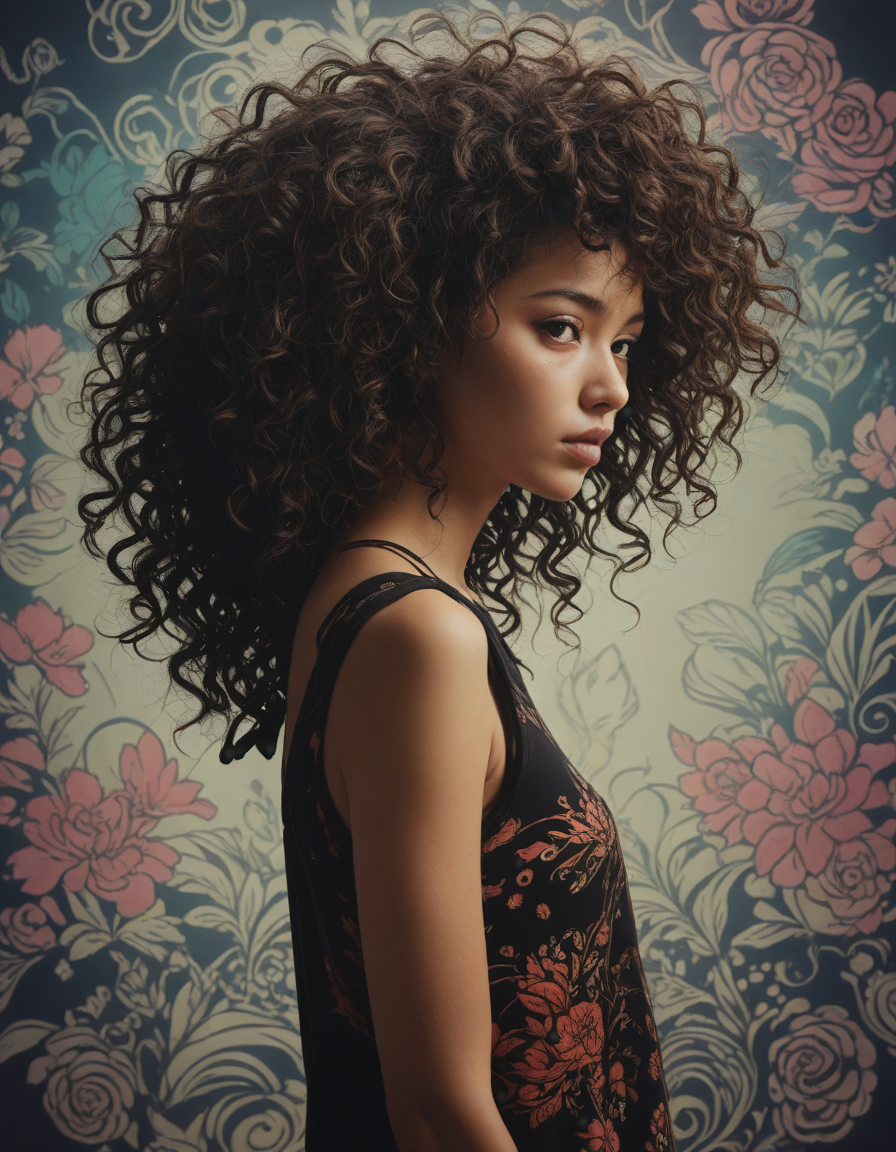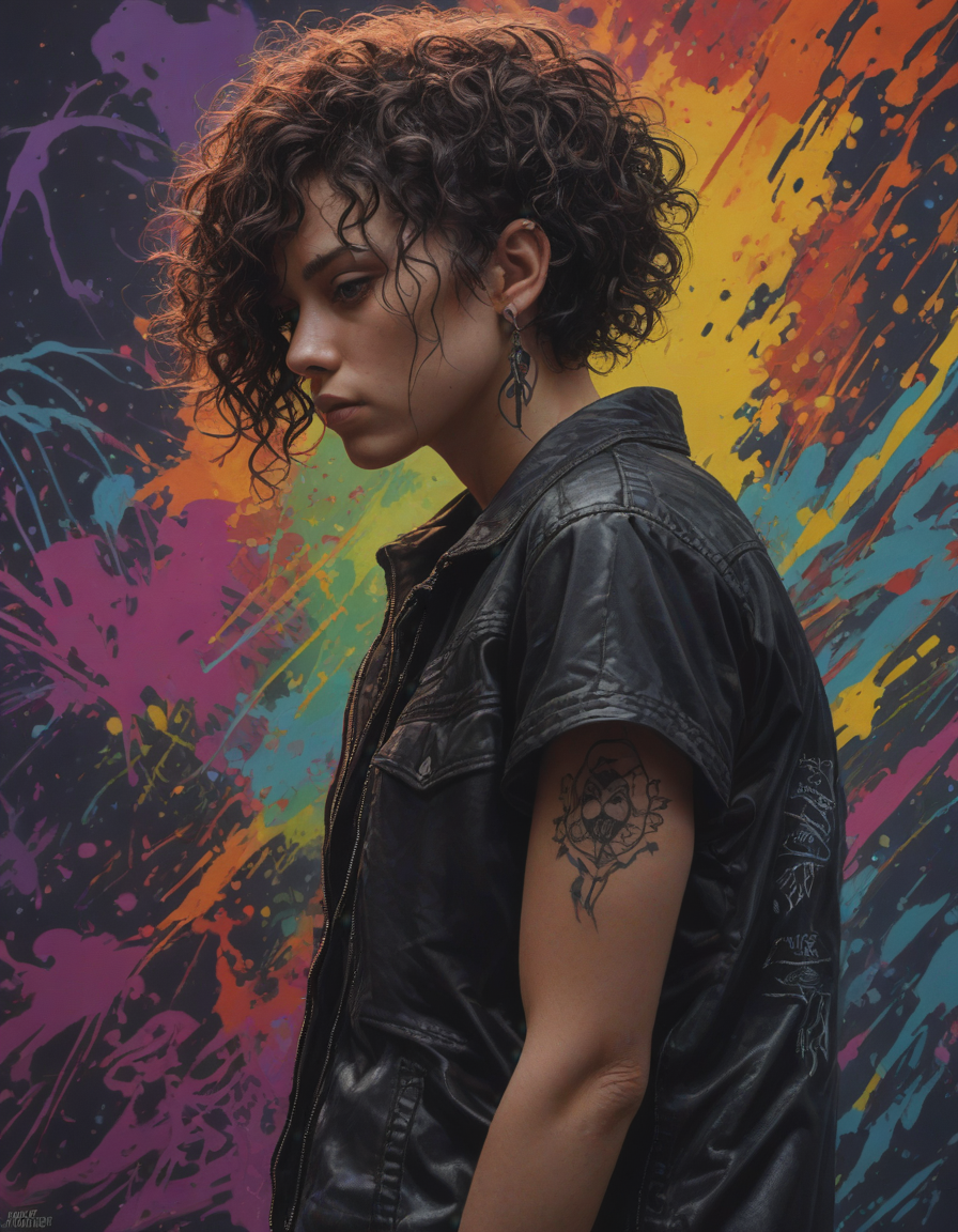 Hushed whispers, nervously wringing damp trembling hands, vibrant wallpaper, heart stopping beauty, curly hair, silhouette, skater punk