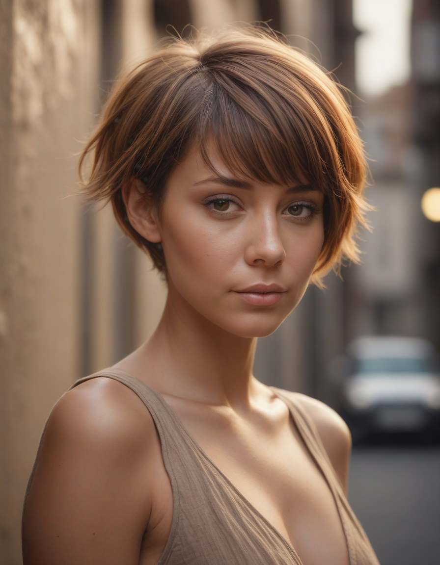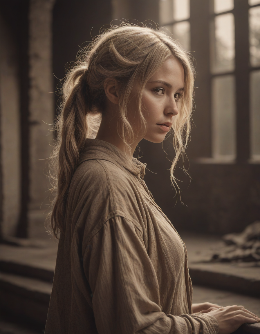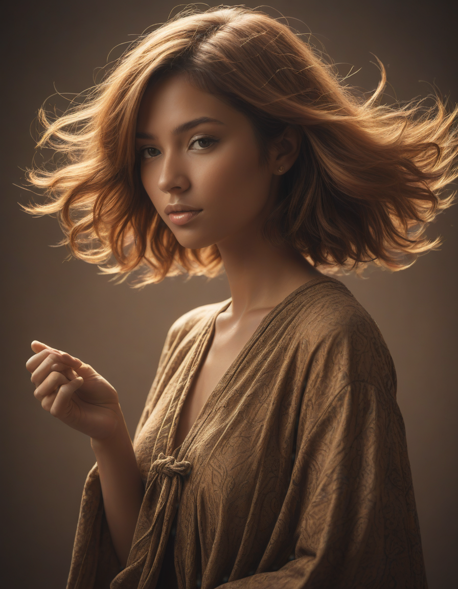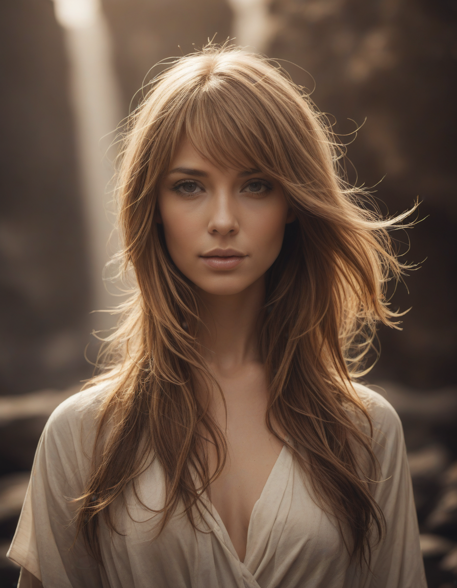 cinematic lighting with moody ambiance, sepia toned photo, paint blending, Whirling maelstroms of radiant energy, bell haircut, Soft morning