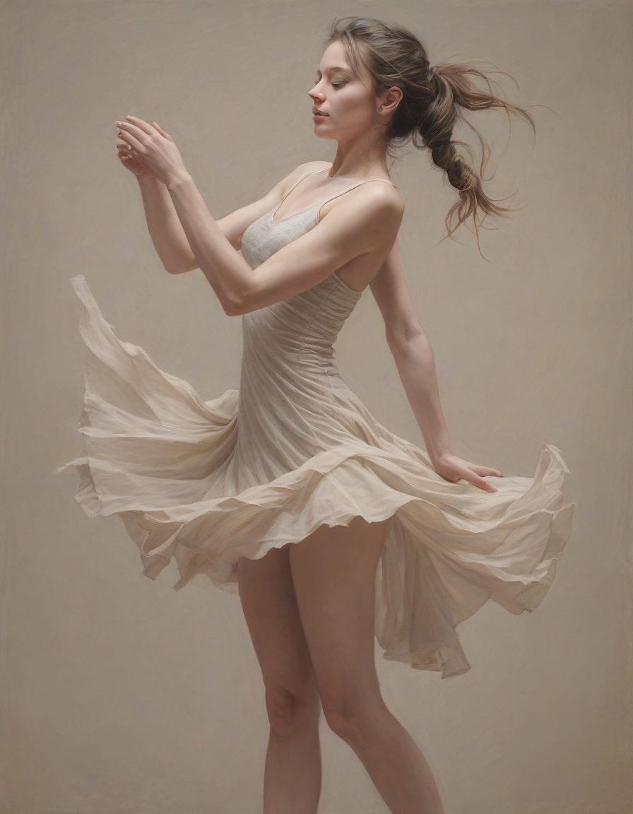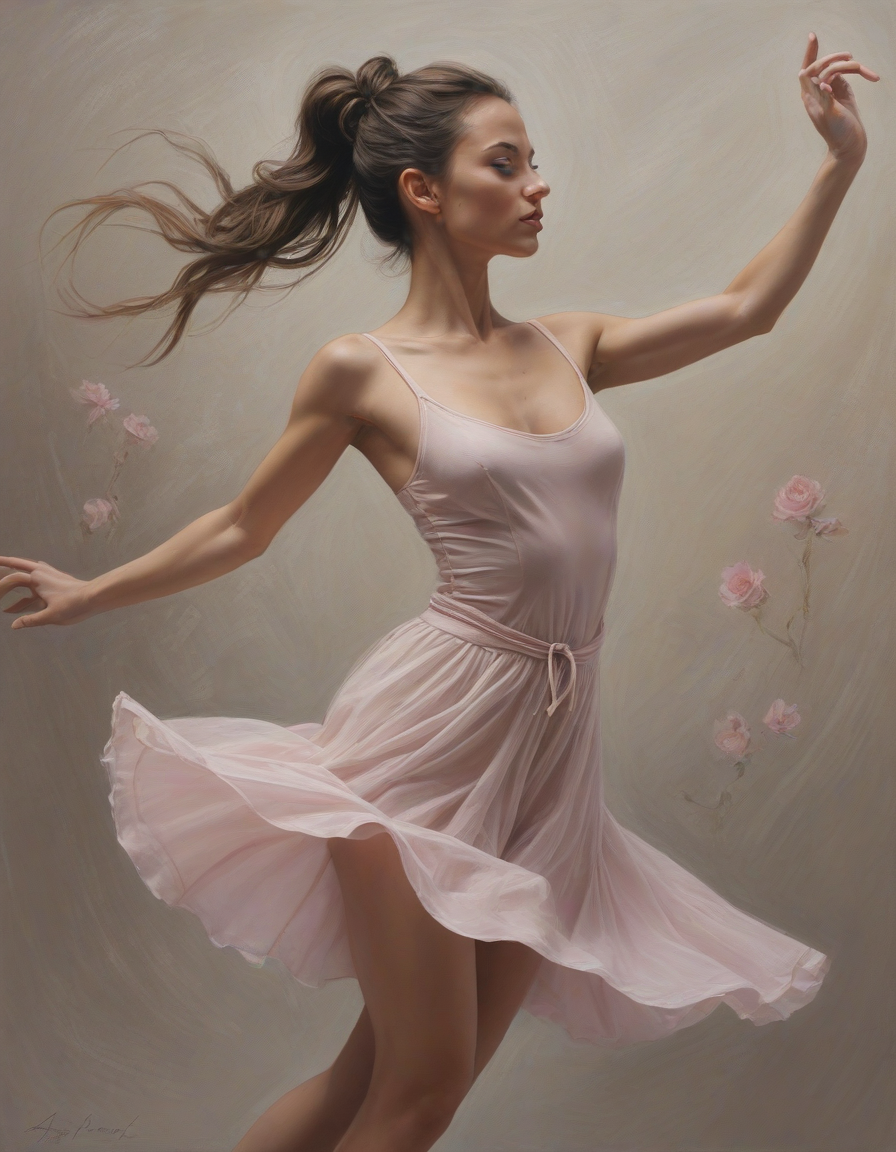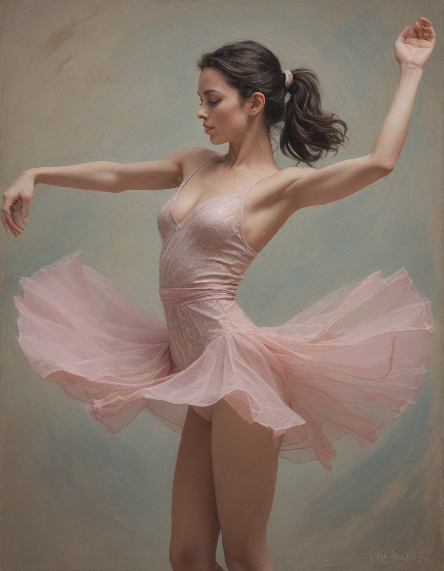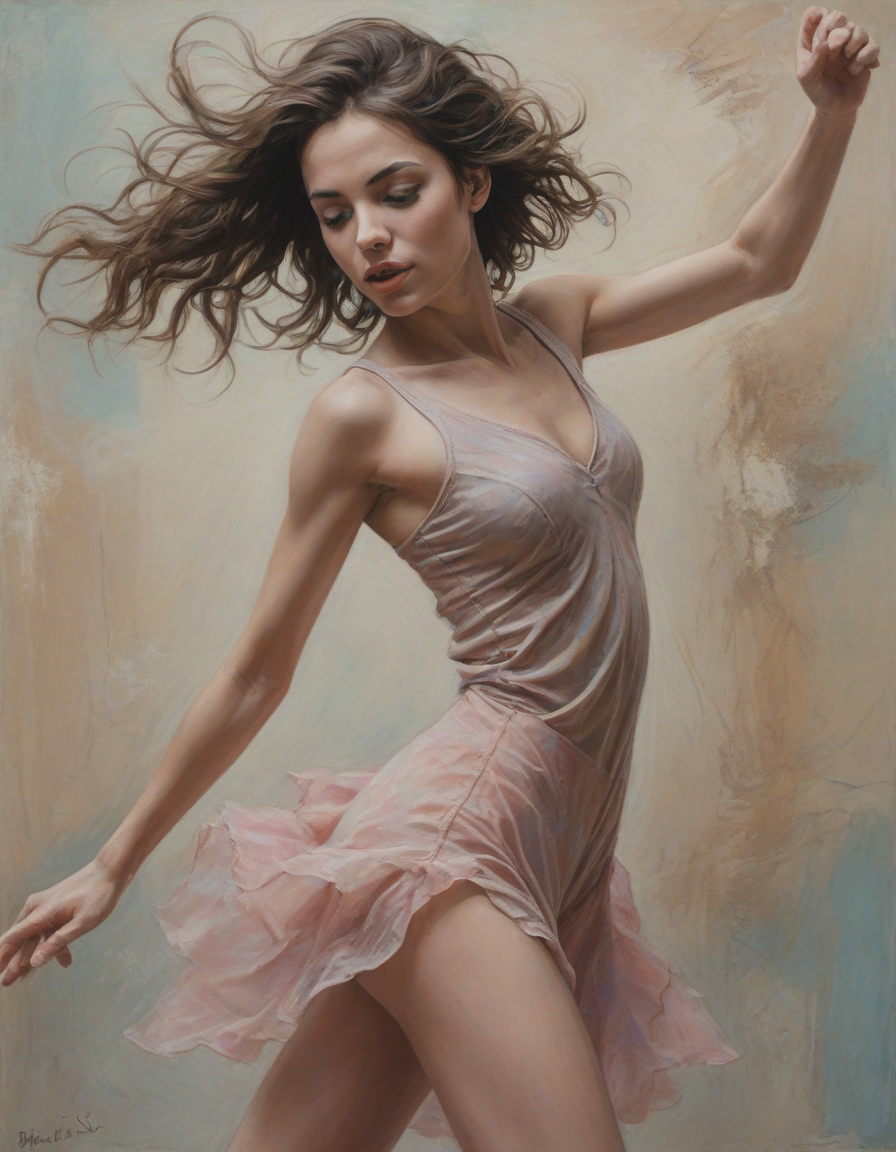 Swift, agile movements of a dancer in perfect harmony, brunette, pastel impressions on rough paper