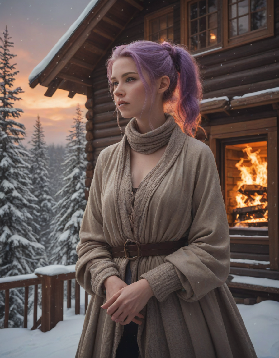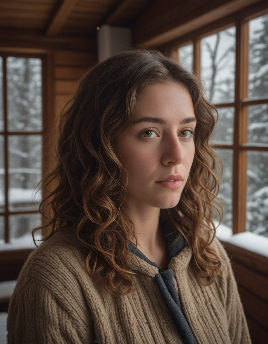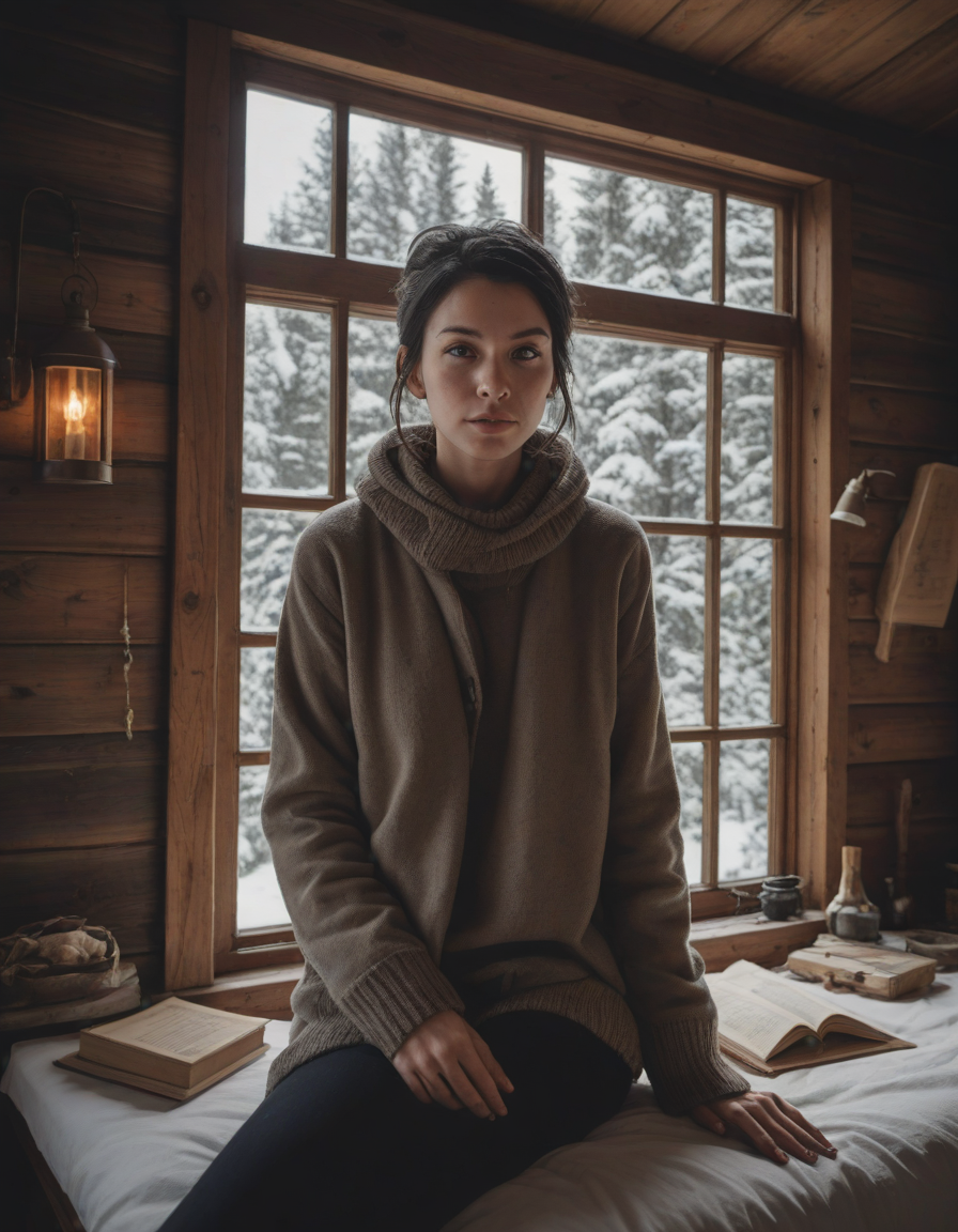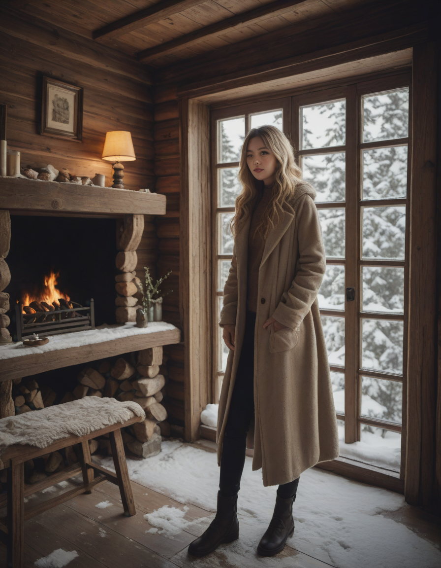 cozy in a cabin with a roaring fireplace while it snows outside, Yearning in gaze