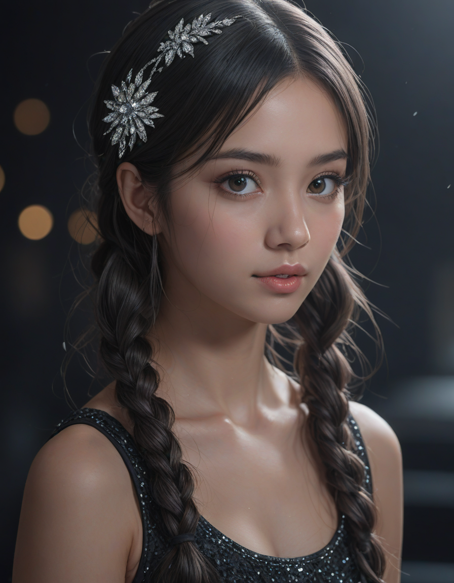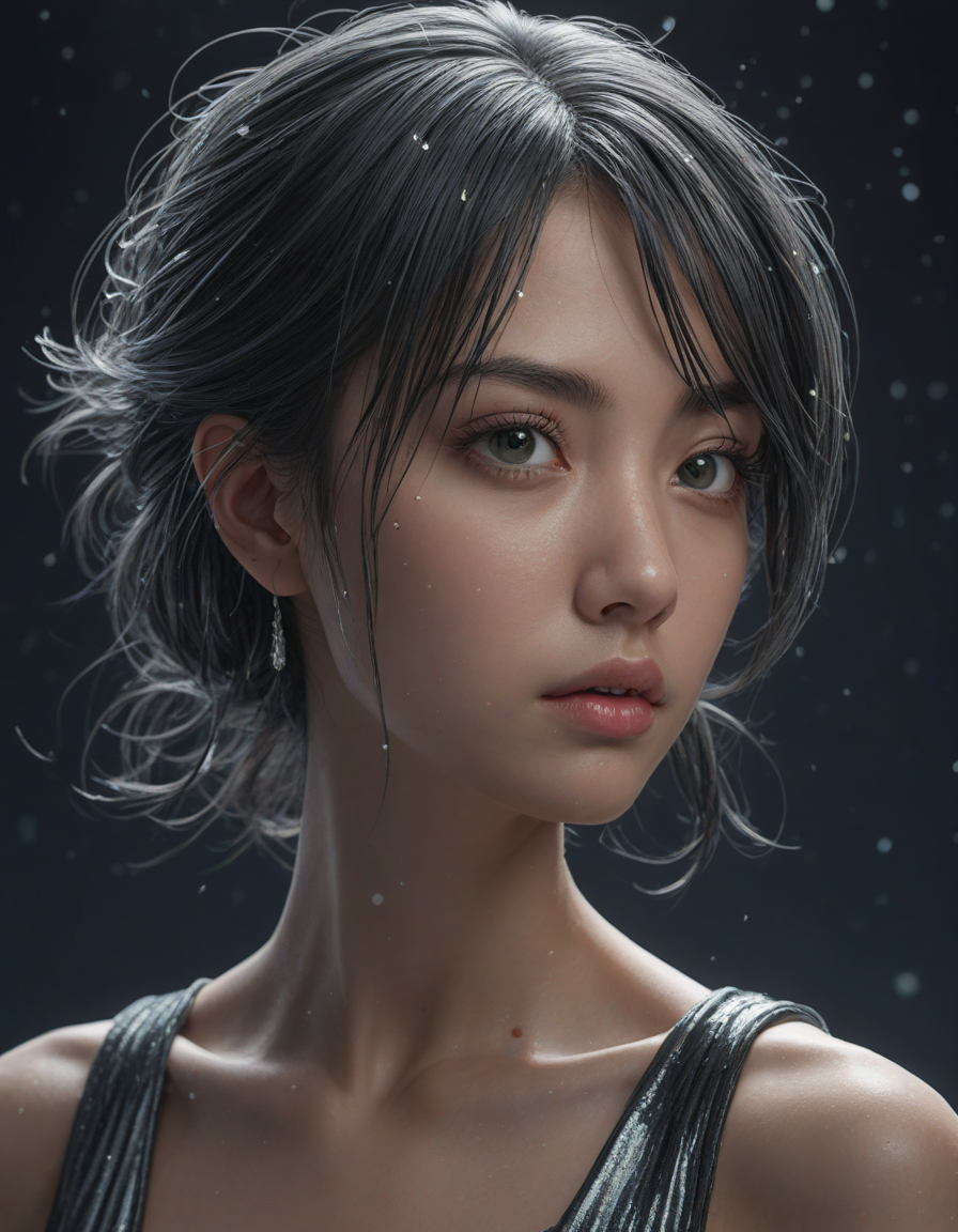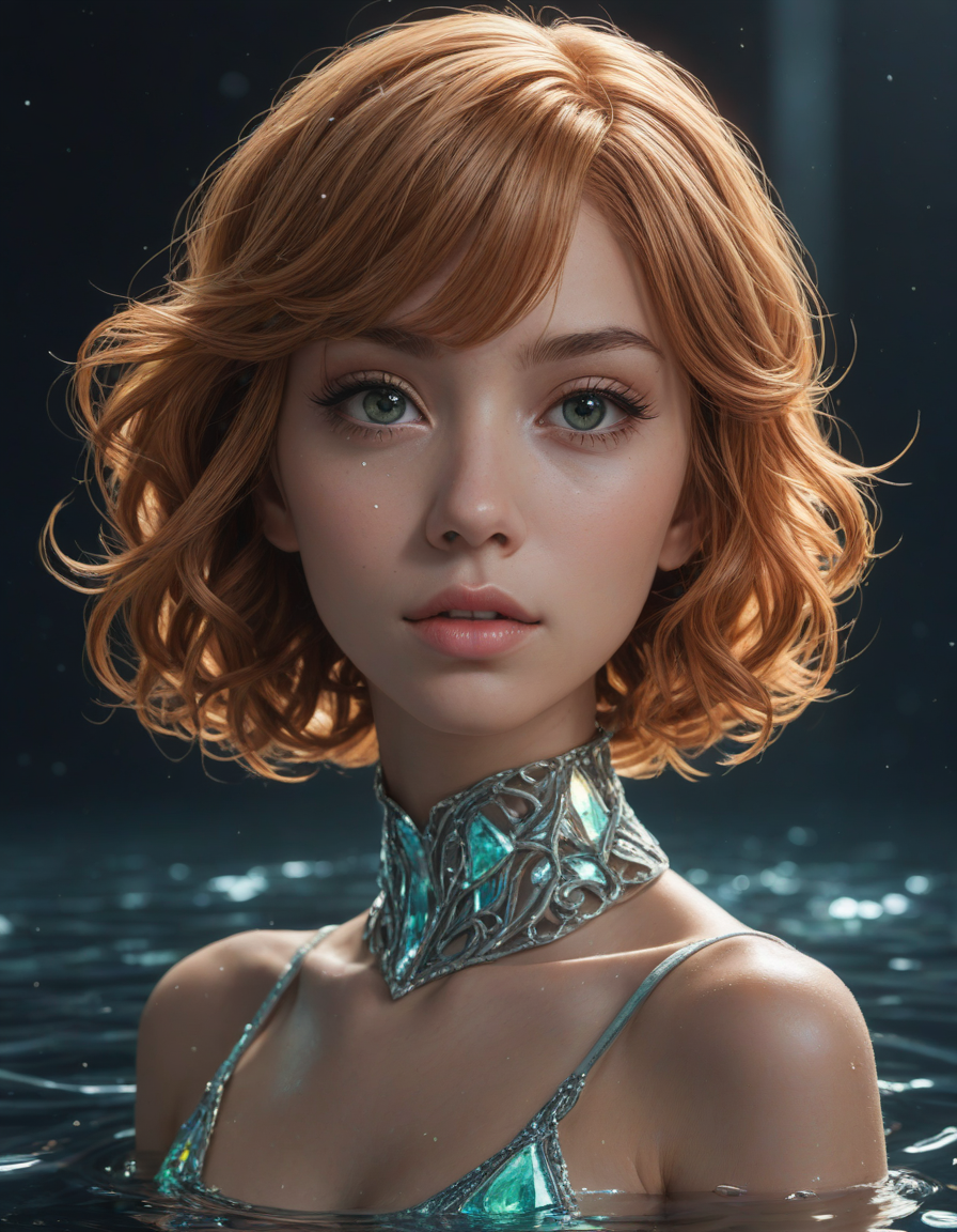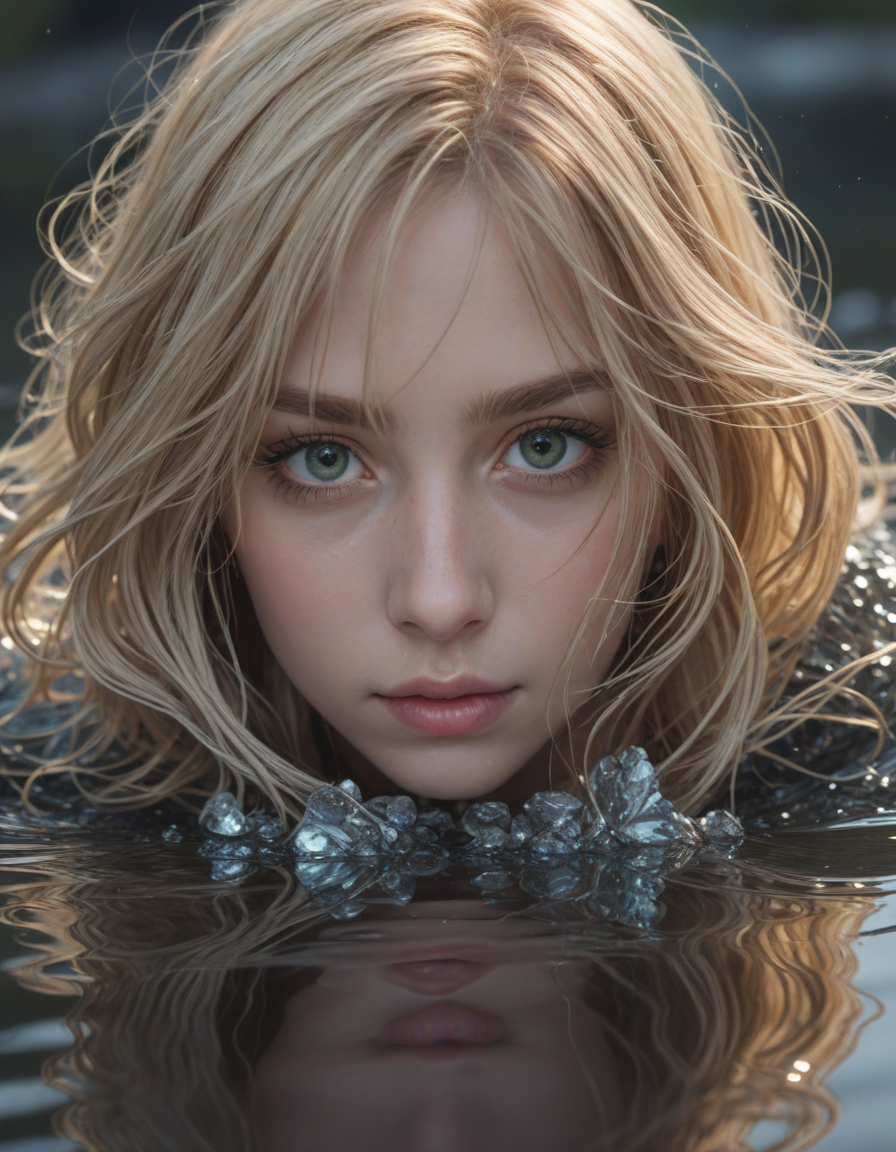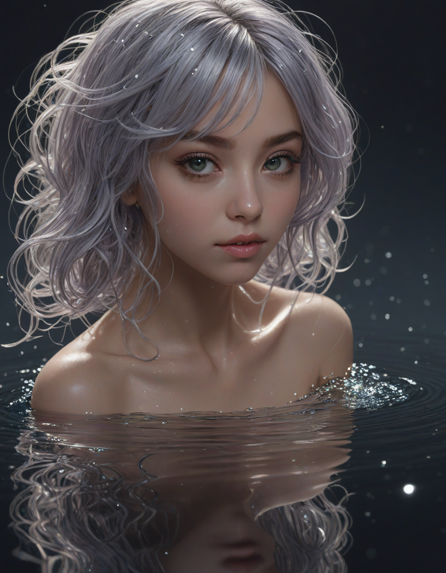 endlessly long eyelashes, shimmering aura, clear, anime, sparkling, Sparkling diamond, looking at viewer, Unsettling reflection in dark still water