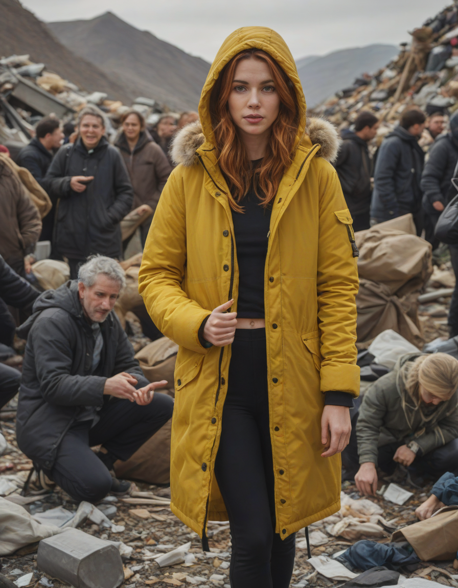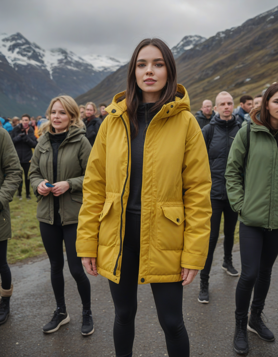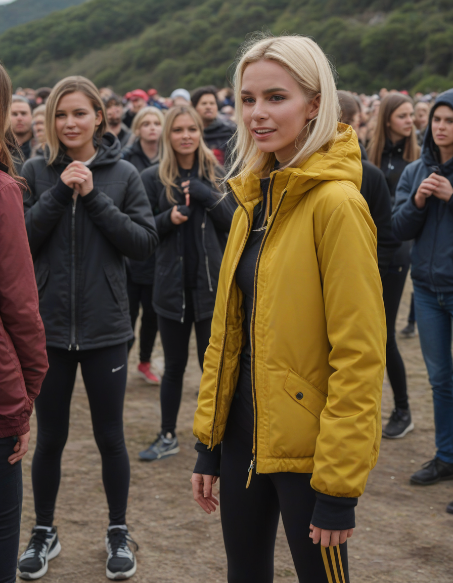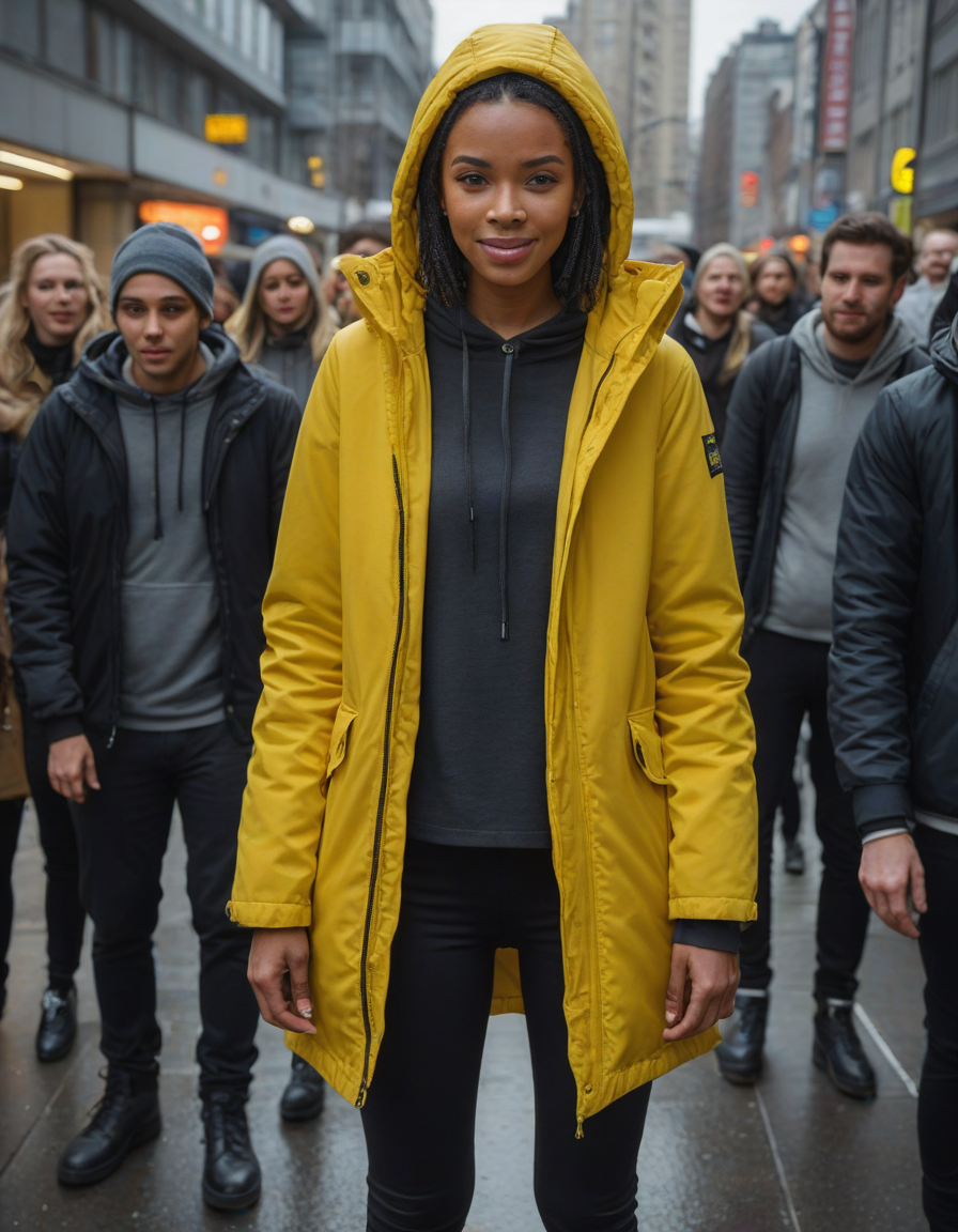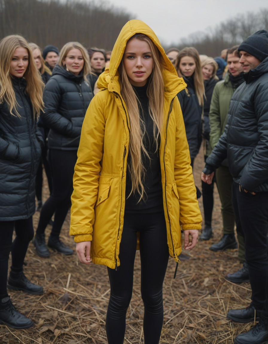 a lady wearing a hooded yellow parka and a pair of formfitting black leggings, surrounded by people, A battle roar, blushing beauty
