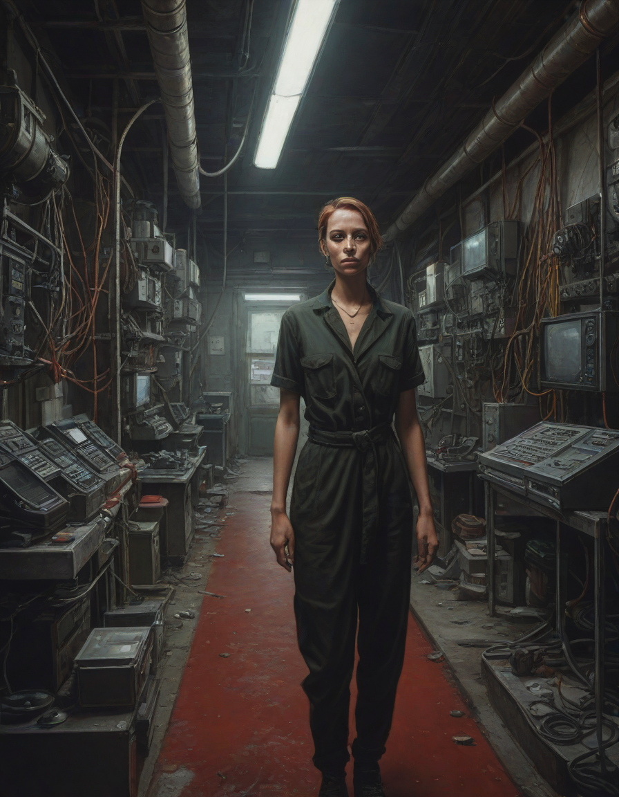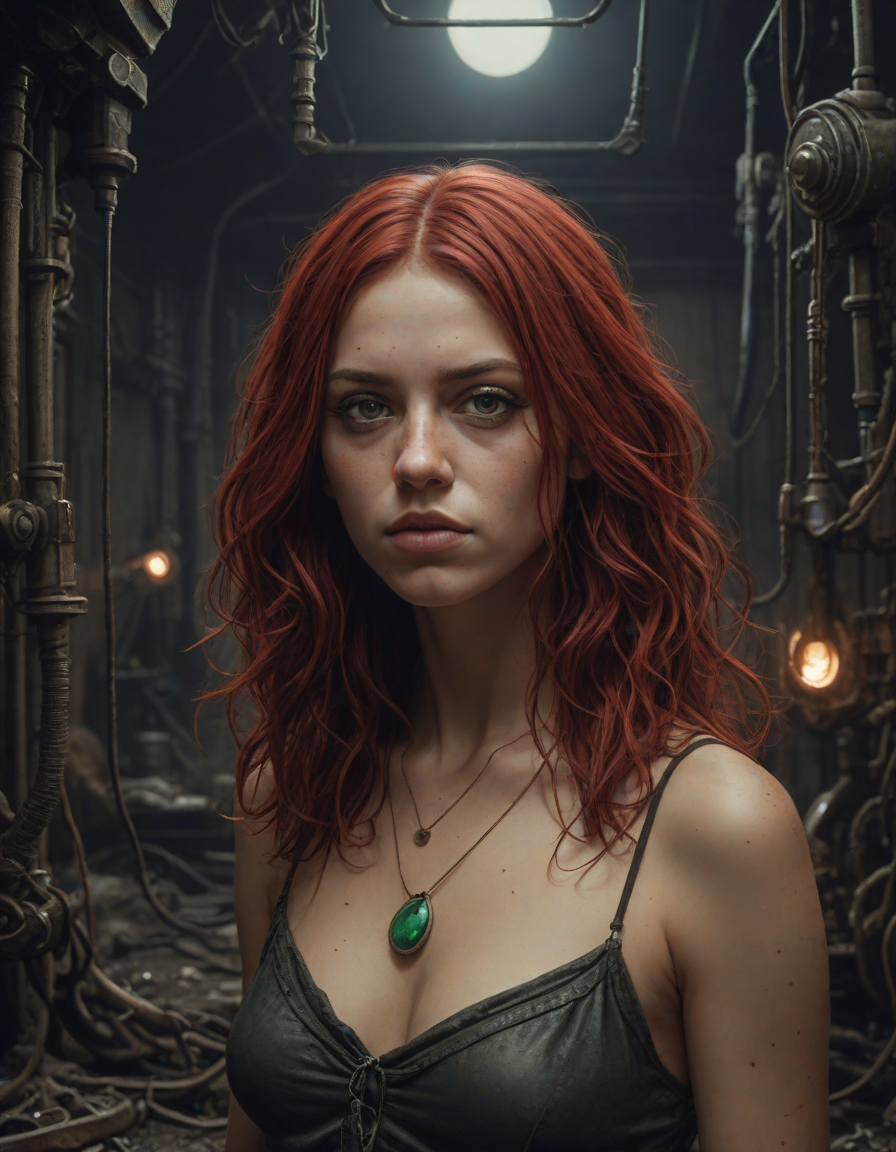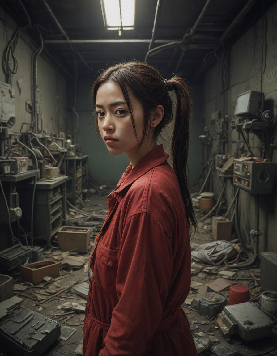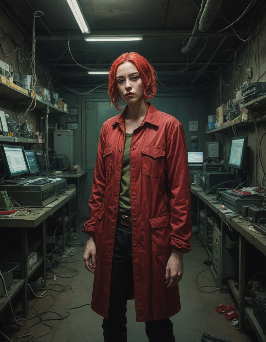 gritty reality, Blinding, in an underground lab, Red Emeralds, 2000s indie art style, apocalyptic