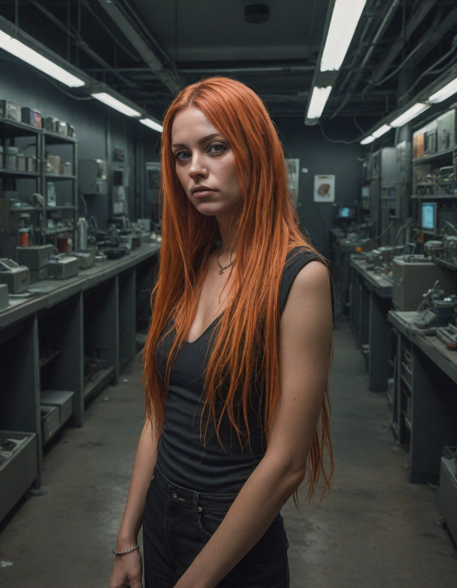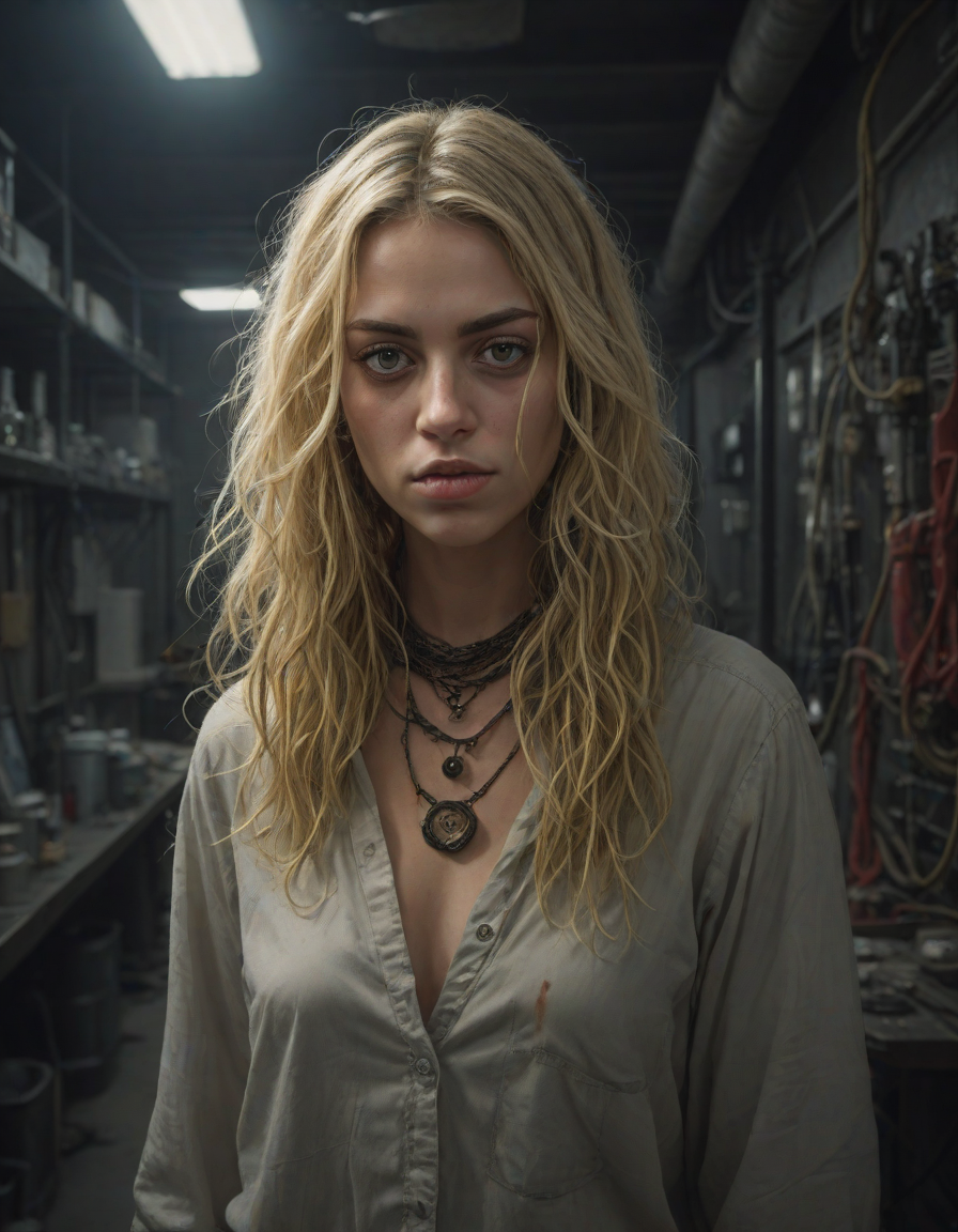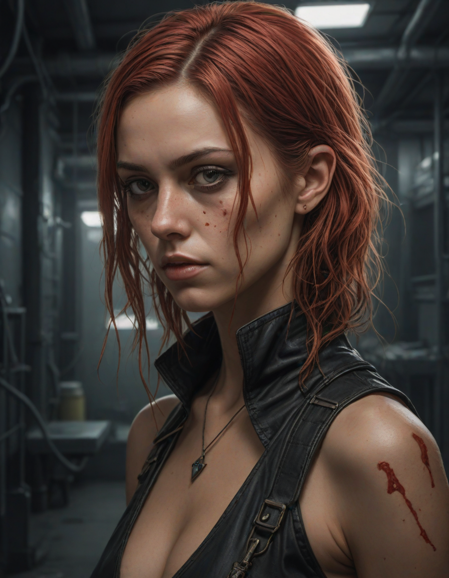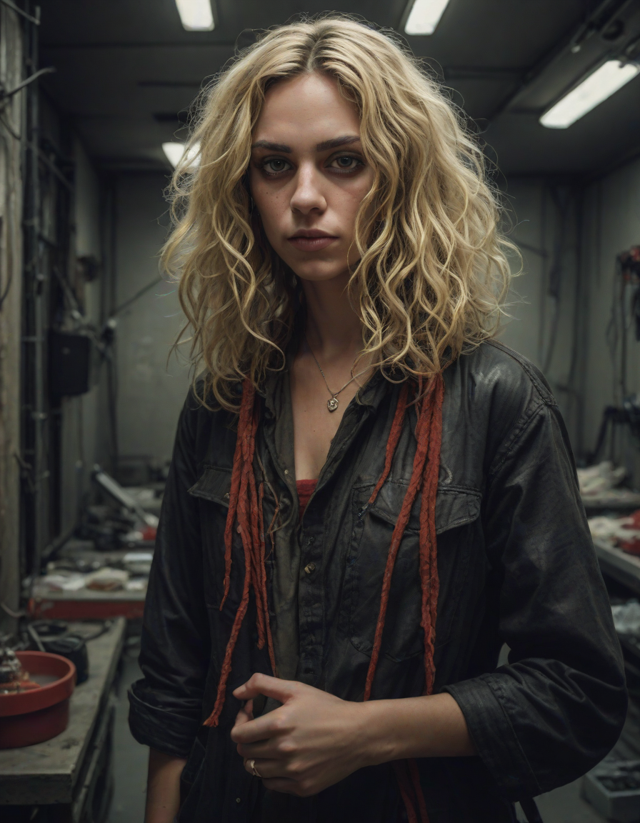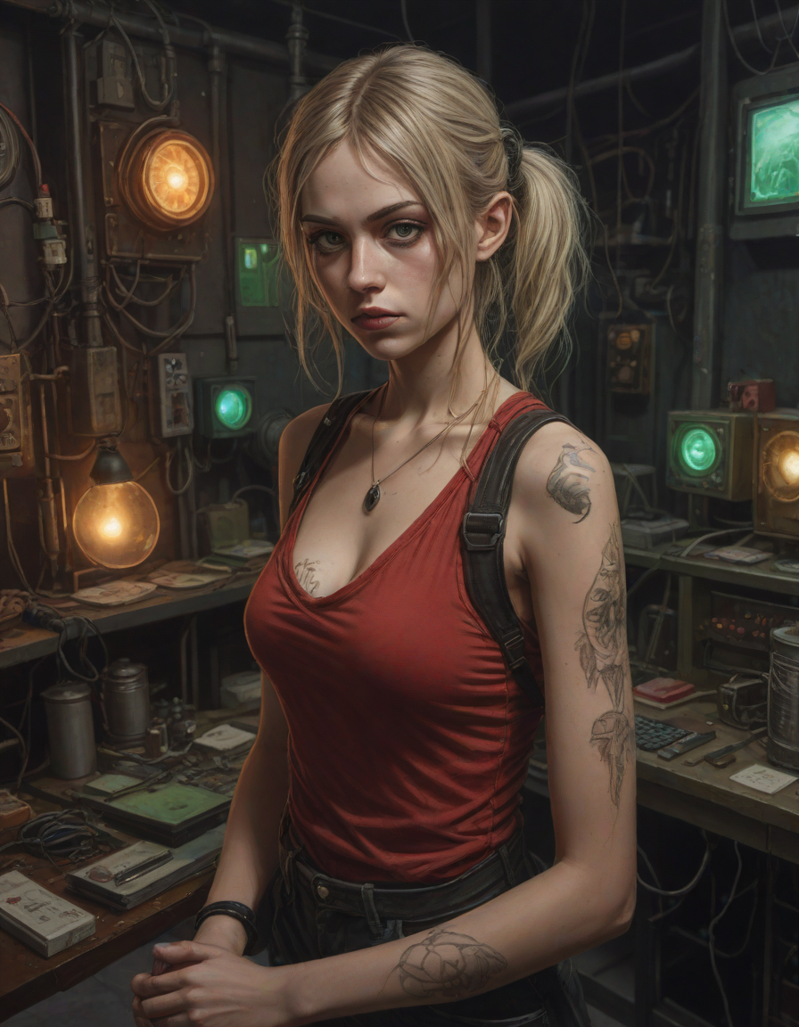 gritty reality, Blinding, in an underground lab, Red Emeralds, 2000s indie art style, apocalyptic