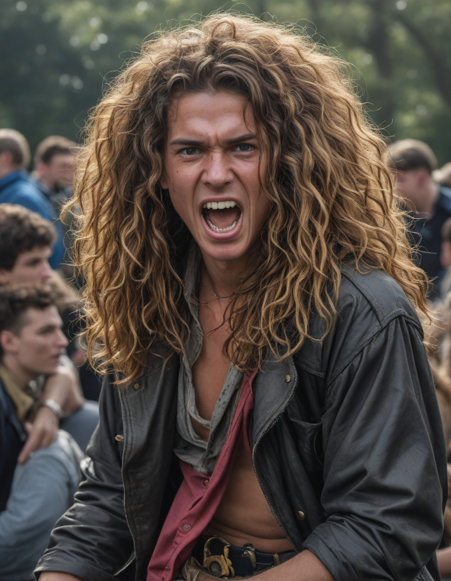 excited, surrounded by people, jaw dropped, New Romantic 80s clothing